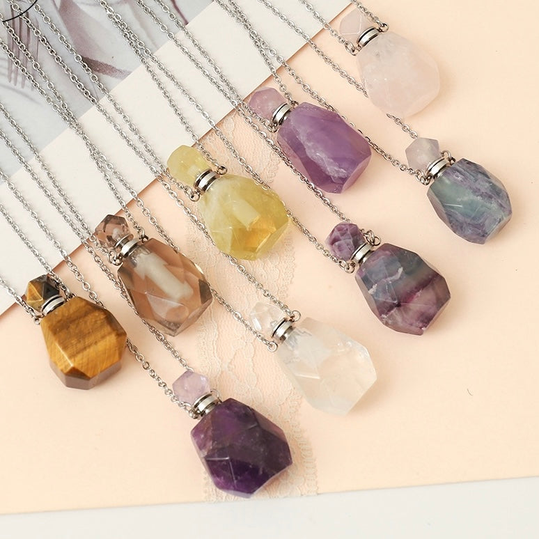 Natural Stone Perfume Bottle Pendant Stainless Steel Necklace Crystal Essential Oil Bottle Necklace Gemstone Perfume