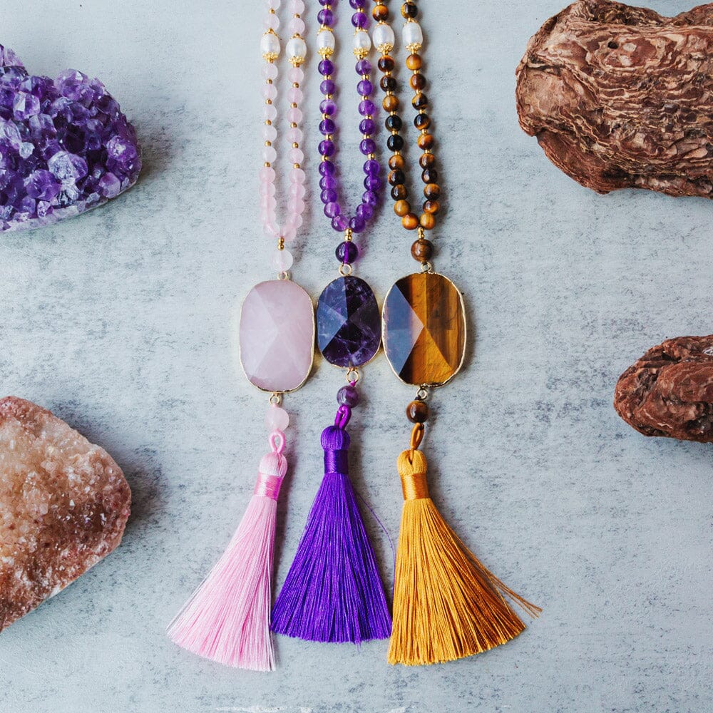 Reikistal Natural Crystal Ball Net Metal Bamboo Necklace Woven Pendant