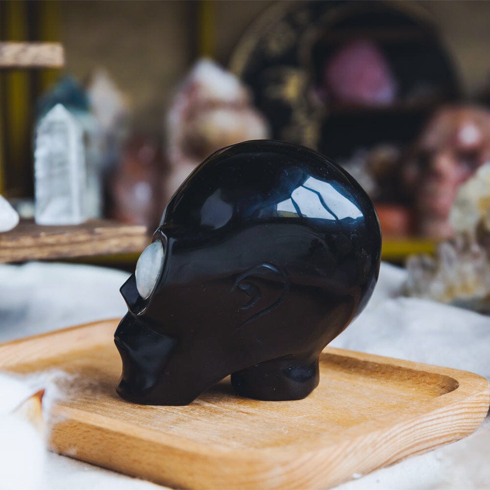 Black Obsidian Alien Skull With Moonstone Eyes